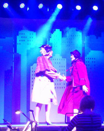 Left: Sky & Miss Brown leave the Bar chaos behind them, with Miss Brown a little worse for wear after all the cocktails she had drank. Sky is left to catch her as she sings "If I were a Bell" Right: Miss Brown (Rhiannon Owen) beautifully sings "If I were a Bell" I've Never Been in Love Before
