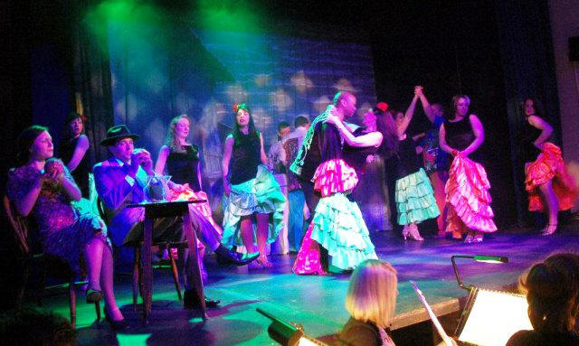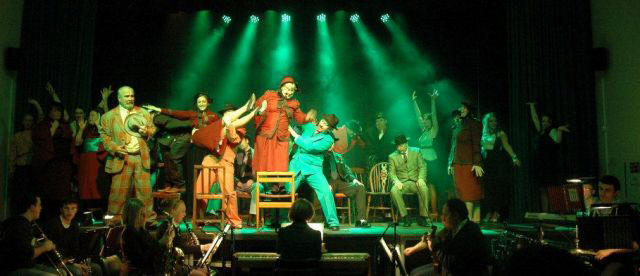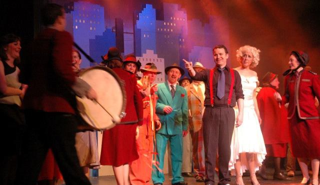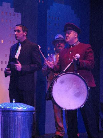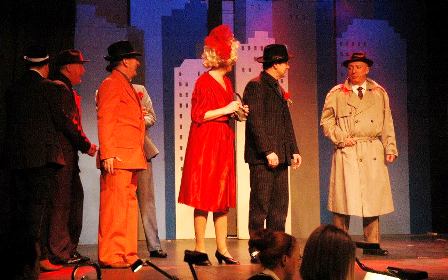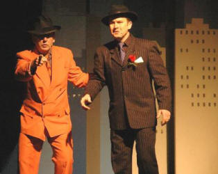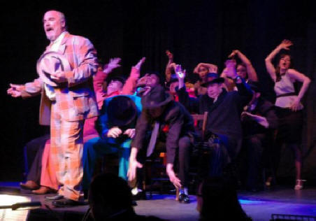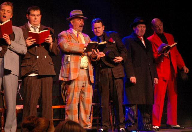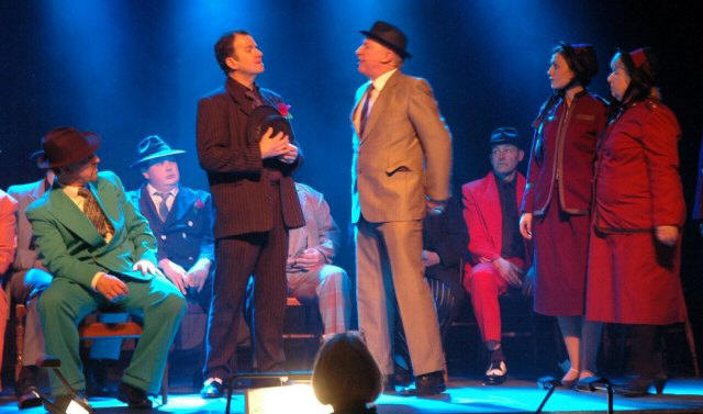 Right: Brannigan (Huw Williams) enters, trying to stop floating crap games. Nathan Detroit (Tim Driscoll) makes up an excuse that everyone is there as its an engagement party for Adelaide & himself Before "More I cannot Wish for"
