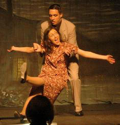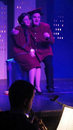 Adelaide (Angie Dymott) & Nathan (Time Driscoll) sing "Sue Me". Nathan is always putting off giving a date for Adelaid & his wedding. Adelaide accuses Nathan of always lying to her about gambling & where he goes when they are not together. Sit down, you're Rockin' the Boat