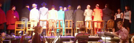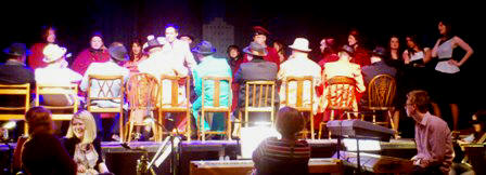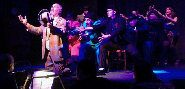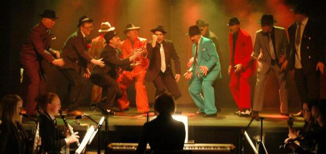 Sky (James Randell) starts the song "Luck be a Lady" as the crap shooters pose in a freeze frame behind.