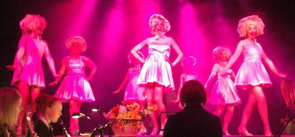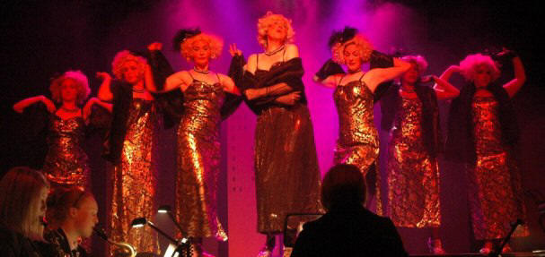 The Hot Box Girls left-right: Emma Amos, Lauren Harris, Angela Driscoll, Angie Dymott, Laura Hallas, Anna Constantinou & Carla Gambarini sing & dance "Take back you Mink, to open Act ii. Adelaide's 2nd Lament