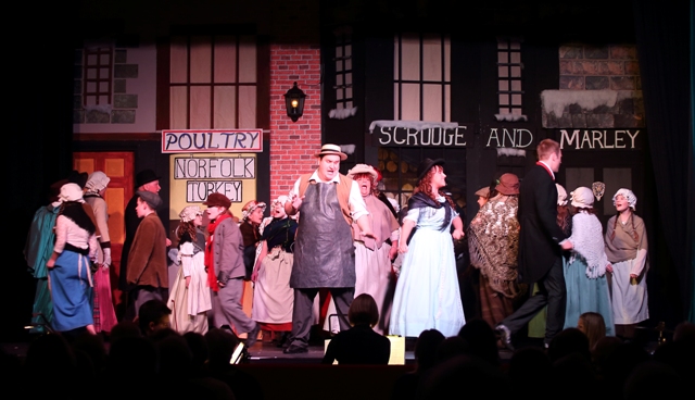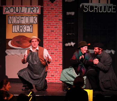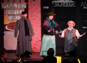 Left: Mr Fezziwig Howard Turnbull with Belle Helen Sturchecher as Dick Wilkins Richard Jones writes at his desk Right: Belle sings Heart of Gold with Young Scrooge Joey Gilles as Scrooge watches