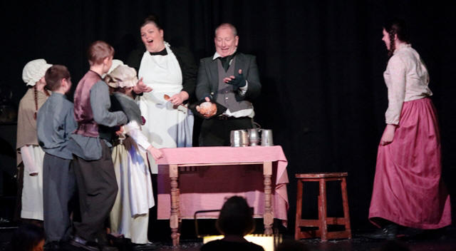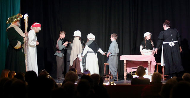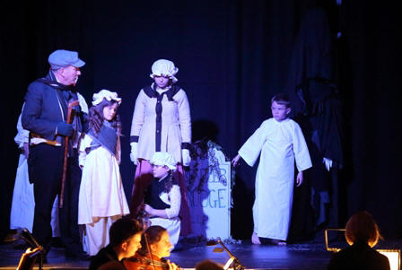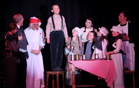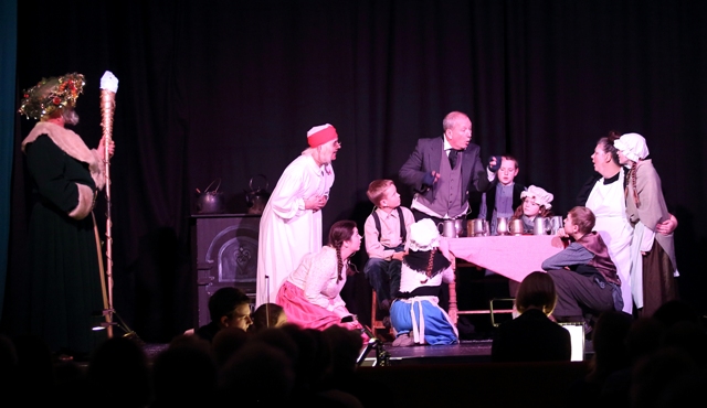 Christmas Present (Mike Beavan) takes Scrooge to the cratchit house to see their christmas. Mrs Cratchit Fiona Jackson (right) is joined by the Cratchit children; Peter Luke Burling, Henry Connor Dunne, Violet Freya Roberts, Ann Angharad Keyse, Mary Elinor Brockhurst, Belinda Libby Beavan & Martha Alice Liney