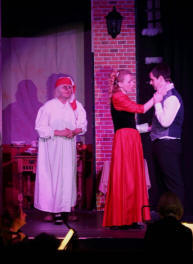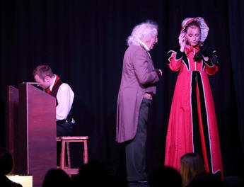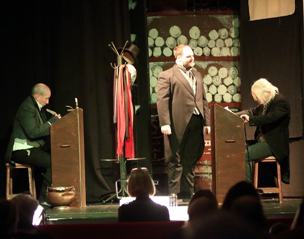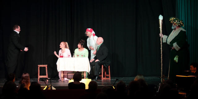 Bob Cratchit (Iain Campbell) sings A Story to the children as Scrooge & Christmas Past (Mike beavan) watch intensely Scene 13 - Fred's Parlour A Lady who can Cook