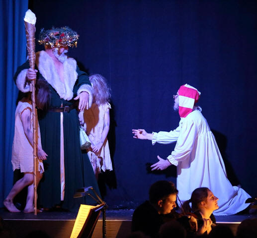 Christmas Present (Mike Beavan) grows tired as the night draws in. Ignorance Nesta Comerford & Want Mari Boundy cling to Christmas Present which frieghtens Scrooge (Tim Driscoll) Scene 15 - Street in London with Old Joe He's Dead