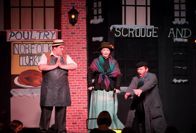 Scrooge (Tim Driscoll) apologises to Mrs Goodheart (Hayley Dunne) & Miss Goodheart (Anna Constantinou) for chucking them out of his office & offers to give their charity a healthy sum.