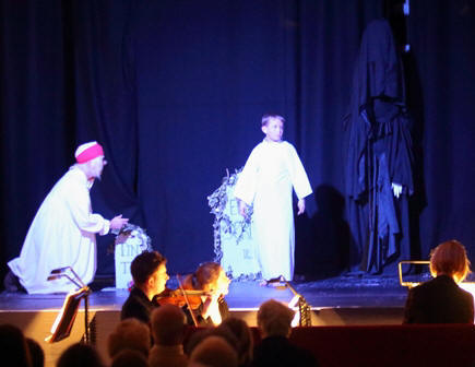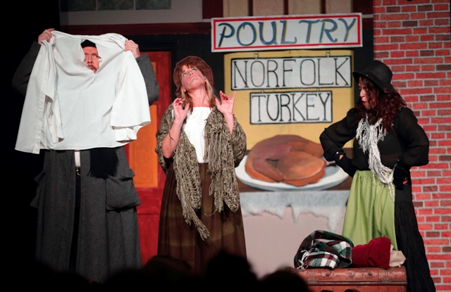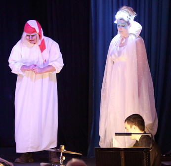 Left: The Poulterer (Gavin Johnson) & Holly Seller Angela Driscoll sing He's dead Right: Old Joe Steve Williams watches on