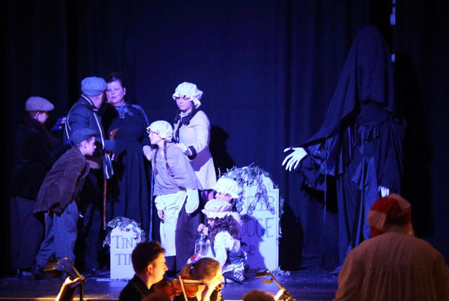 Left: Some of the Cratchit's stand over Tiny Tim's Grave mourning their loss singing Tiny Tim. The Ghost of Tiny Tim (Dylan Jones) can be seen on the right next to the Spirit of Christmas Future Richard Jones Right: The rest of the Cratchit's enter to say their goodbyes as the Spirit stands pointing to Ebenezer's Grave