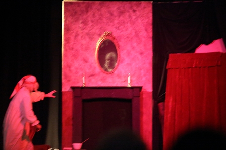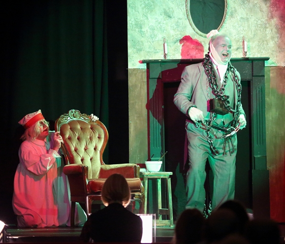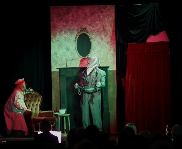 Jacob Marley (Phil Davies) appears through the fireplace as Scrooge (Tim Driscoll) cowers by his chair