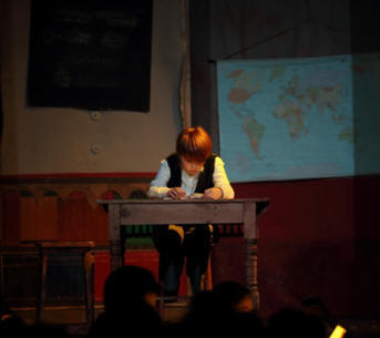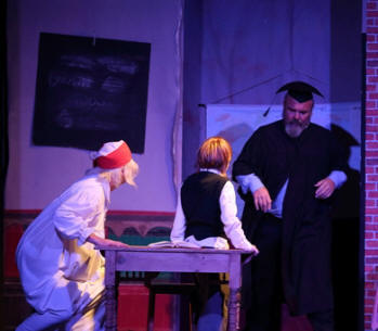 Left: Boy Ebenezer Gwyn Hampton-Watkins sat at his desk Right: School Master Mike Beavan enters as Scrooge (Tim Driscoll) watches intensely Scene 7 - Street