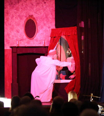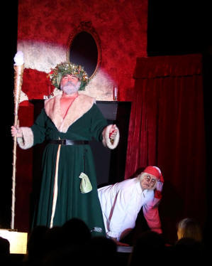 Left: Scrooge (Tim Driscoll) hears a humming coming from his bed Right: The Ghost of Christmas Present Mike Beavan climbs out from the bed singing Good King Wenceslas Scene 10 - Street in London Snow in London