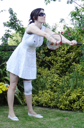 Left: Chris (Angie Dymott) enters looking for Rod her husband, who has disappeared into the fete's beer tent. Chris congratulates Ruth on her ferret costume. Right: Chris picks up Cora's "Tea Tray on An International Theme" Montego Bay. The trees are made from beer bottles & the waves are are Ferrero Rocher wrappers.